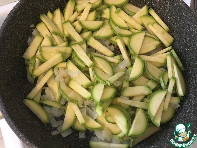 К луку добавить нарезанный кабачок. Как вы будете нарезать овощи - это неважно, мы все равно все потом измельчим в пюре. Кабачок жарим почти до готовности.