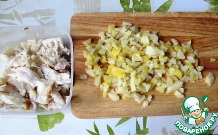 Рыбу разбираем на кусочки. Отварной картофель мелко нарезаем или грубо разминаем толкушкой.