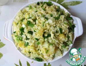Картофель смешиваем с натертым сыром, мускатным орехом и нарезанной зеленью. У меня был зеленый лук.