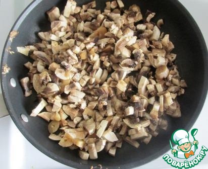 Репчатый лук и свежие грибы мелко нарезать и обжарить до готовности на растительном масле. Переложить в миску и оставить до полного охлаждения.