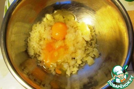 Добавить в картошку растопленное сливочное масло, муку, тертый сыр и вбить яйца.