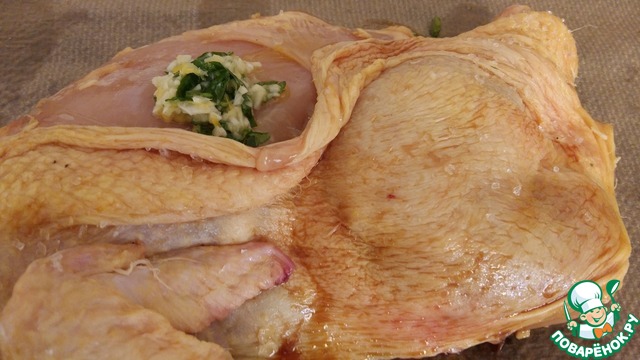 Полученной смесью обильно натереть цыпленка со всех сторон, в том числе и под кожей.