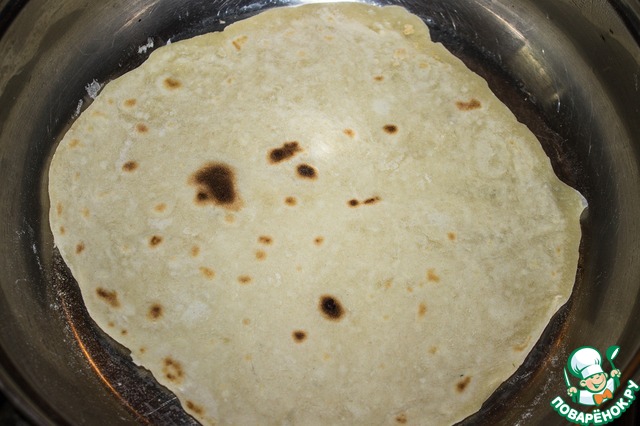 Отдохнувшее тесто раскатываем в лепешку и печем на сухой сковороде до появления коричневых пятнышек с двух сторон. Готовую лепешку заворачиваем в полотенце и убираем в сторону.
