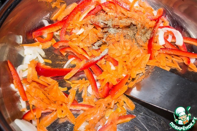 На разогретую сковороду кладем 1,5 ст. л. сливочного масла, добавляем пару капель растительного масла, перец с морковью и луком, молотые кориандр и перец и обжариваем 3-4 минуты на среднем огне.