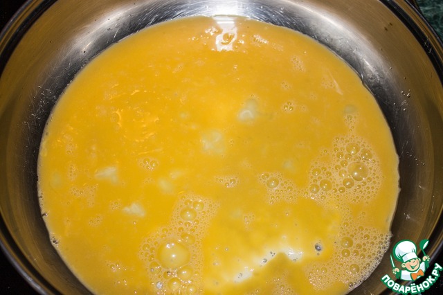 На горячую сковороду выкладываем 1 ст. л. сливочного масла, выливаем взбитые яйца и жарим минуты 2-3 на медленном огне, пока яичная масса не схватится.