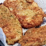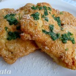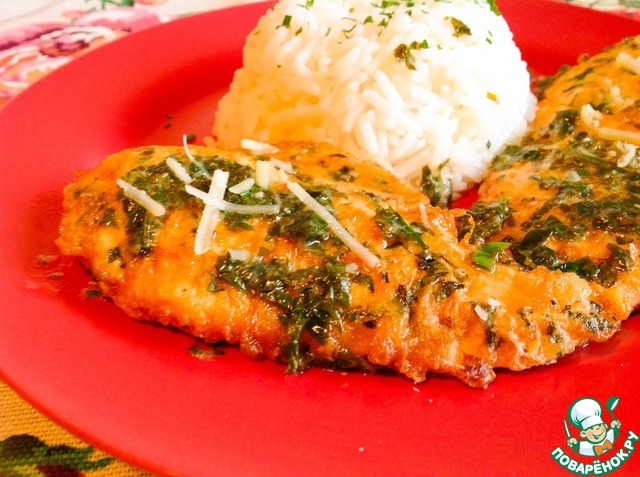 Нагреть оливковое масло в большой сковороде на среднем огне. Куриные грудки обвалять в муке, затем окунуть в яйца, дать излишкам стечь и обжарить грудки по 2-3 мин. с каждой стороны до золотистого цвета. Готовую курицу выложить на блюдо.
