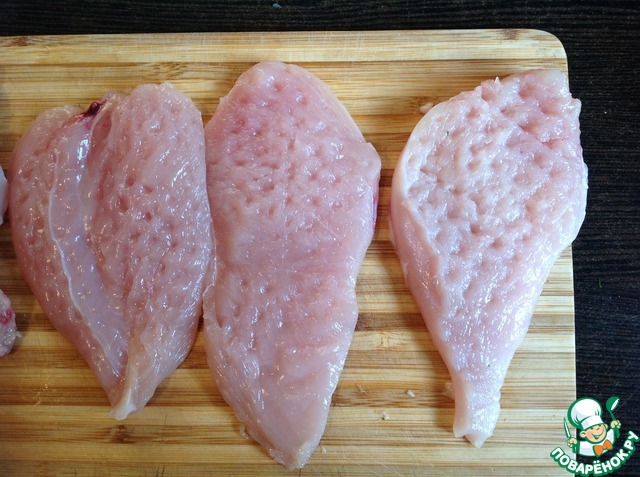 Пока варится рис, займемся курицей. Поместить куриные грудки между двумя листами полиэтиленовой пленки и осторожно отбить молотком до толщины 0,5-1 см. Если грудки очень крупные, предварительно разрезать вдоль пополам. Чуть посолить, поперчить. При желании посыпать ароматными сухими травками.