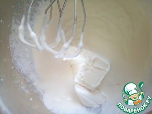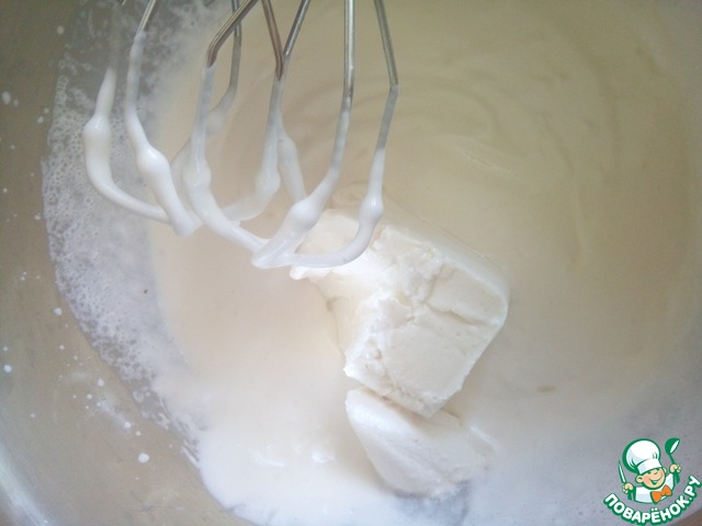 Добавить постепенно сгущенку и продолжить взбивать миксером до однородности. Добавить по частям творожный сыр продолжая взбивать и ванилин.