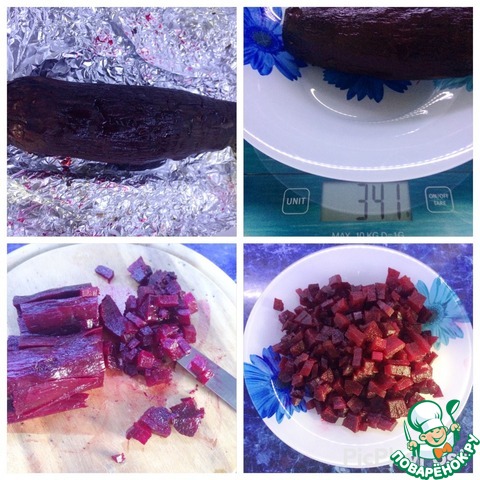 Запечь свеклу, остудить, почистить, нарезать кубиками.
