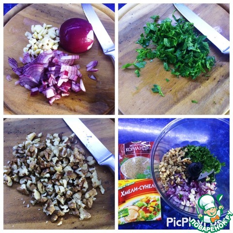 Лук и чеснок чистим и мелко нарезаем. Промываем зелень и измельчаем. Измельчить грецкие орехи.