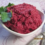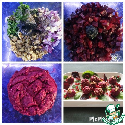 Соединить в блендере орехи, лук, чеснок, зелень, винный уксус, специи и соль. Размолоть до получения однородной массы. Добавить свеклу в блендер и взбить с подготовленной заправкой до однородности. Влажными руками сформировать из массы шарики и выложить их на сервировочную тарелку. Украсить грецкими орехами. Приятного аппетита!