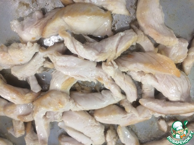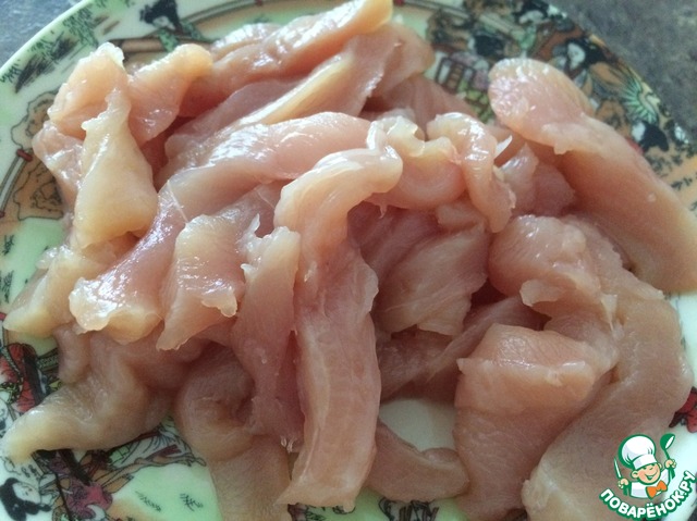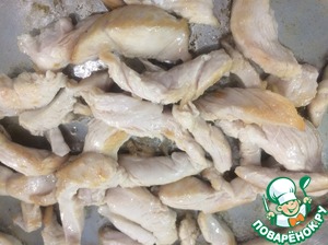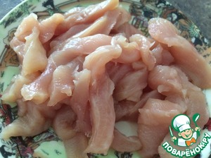 Тем временем нарезать куриное филе небольшими полосками. -