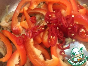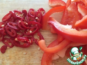 Нарезать оба вида перца. Красный жгучий, колечками, семена не убирать, так будет ароматнее и придаст более острый вкус блюду. Болгарский перец нарезать полосками, не мелкими.