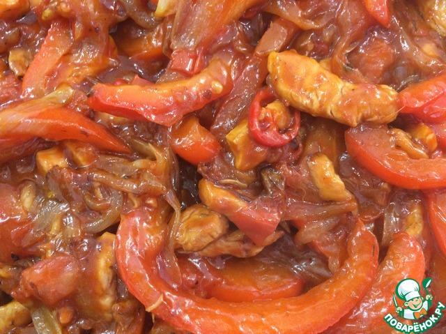 К овощам и курочке добавить томатный соус или кетчуп. Перемешать. Попробовать на соль, сахар, специи. Если у Вас просто томатный соус и не хватает кислоты, добавьте несколько капель лимонного сока или уксуса. Потомить, чтобы все ингредиенты "подружились", буквально минутку. Выключить.