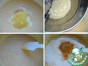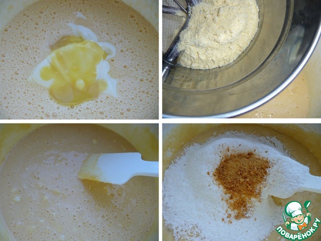 Кукурузную муку смешать с разрыхлителем и просеять в яично-масляную смесь.