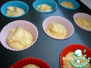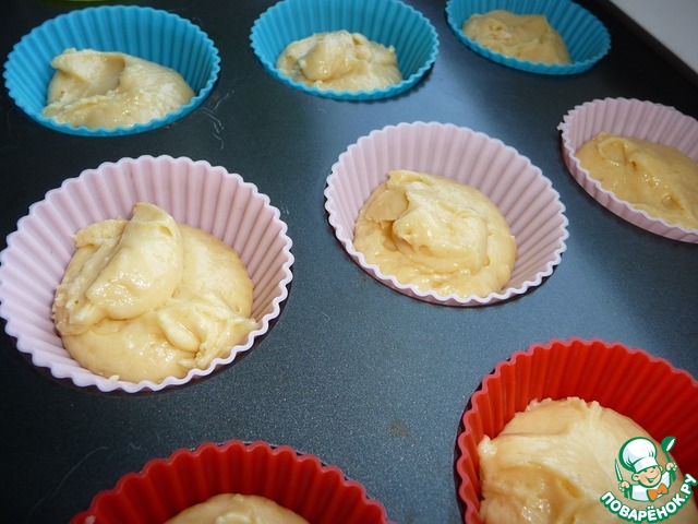В порционные формочки (смазать маслом, силиконовые не смазывать) для выпечки кексов выкладывать по 1 ст. л. теста.