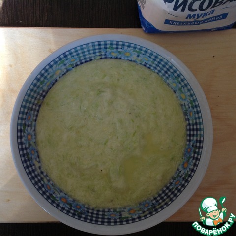 Добавить рисовую муку. Муки может понадобиться больше или меньше в зависимости от размера кабачка. Хорошо перемешать. Тесто должно получится средней густоты.