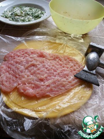 Пока вода под рис закипает, филе вымыть и хорошо обсушить. У меня большое филе, поэтому я отбиваю его целиком- надрезав края, чтобы держало форму и накрыв пленкой, чтобы не пачкать все кругом. Отбить несильно, но равномерно.