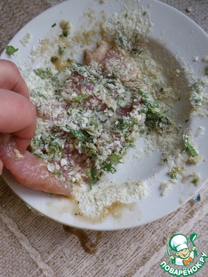 Для панировки нарубить промытую и просушенную зелень петрушки - только листочки. Смешать с сухим картофельным пюре, поперчить и добавить сухой чеснок в порошке и черный перец. Свежий чеснок в жарке я не люблю.