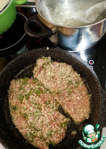 Обмакнуть отбивную в яйцо и хорошо запанировать в картофельной смеси, прижимая ее поплотнее.