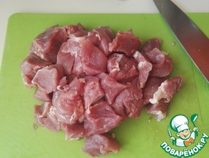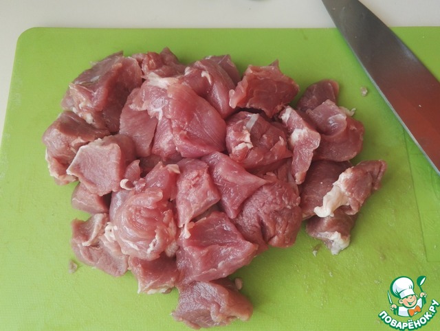 • Мясо (я беру кезку) режем кусочками 2.5*2.5 см