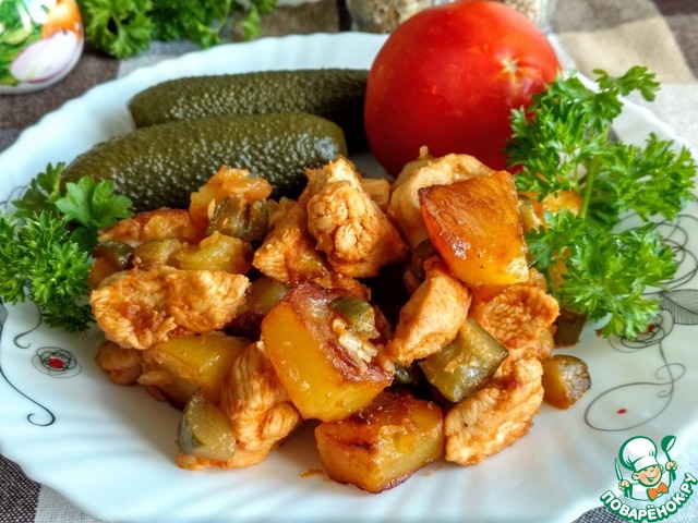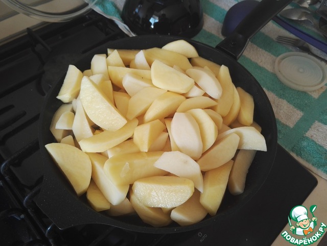 • Пока тушится мясо с оогурцами, луком и т. пастой, на отдельную сковороду заливаем остальное масло и на очень сильном огне жарим картофель до золотистых корочек, почти до готового состояния
