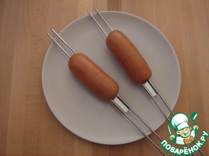 Для подачи я взяла сардельки и сделала их под грилем на шампурах. Это очень быстро и вкусно.