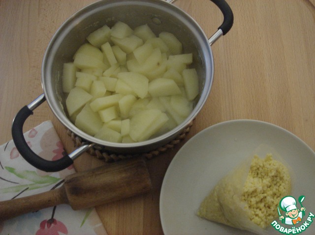 Делаем всё сразу, если позволит плита. Ставим варить пшено, следуя указаниям на упаковке. В другой кастрюле варим картофель в подсоленной воде по вкусу, а в сковороде обжариваем лук.