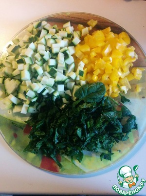 Нарезаем овощи: перец, цукини небольшими кубиками шпинат крупными полосками.