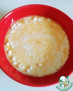 В отдельной миске взбиваем яйца с творогом и молоком. Солить и перчим.