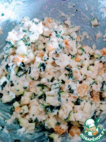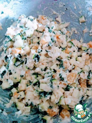 Добавить получившуюся смесь к муке и тщательно перемешать. Далее добавить в тесто цукини, вяленые томаты и тертым сыр.