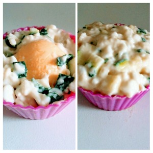 Тесто распределяем в формочки для маффинов так, чтобы в центре образовалось небольшое углубление, куда кладем яичный желток, а затем аккуратно закрывпем его тестом. Рецепт рассчитан на 12 маффинов, у меня было только три желтка и, соответственно, три мафина с сюрпризом.