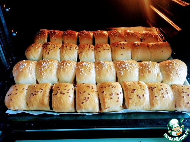 Смазываем взбитым желтком с молоком и посыпаем пироги кунжутом и/или семенами льна. Оставляем постоять в течение 20 мин. Выпекаем в разогретой до 180 градусов духовке примерно 25 минут.