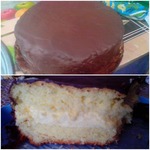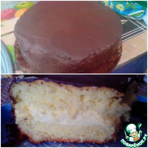 Остывший бисквит разрежьте на две части. На нижний корж нанесите весь крем, разровняйте и накройте вторым коржом. Шоколад растопите на водяной бане и перемешайте с растительным маслом. Верх торта и бока полностью покройте шоколадом. Уберите торт в холодильник на 30—60 минут. Торт ничем не украшался, но вы можете украсить его по своему желанию. Пошаговое приготовление смотреть видео
