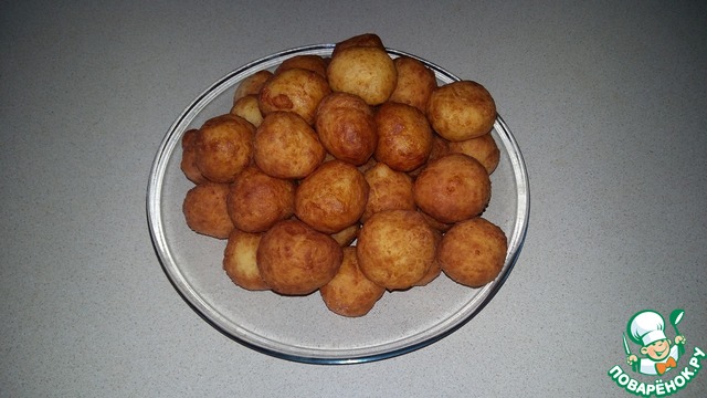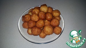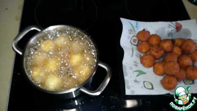 Налить в небольшую кастрюлю с толстым дном растительное масло и расскалить его. Аккуратно спускаем наши шарики. Жарятся они достаточно быстро! Вылавливаем шумовкой и выкладываем на одноразовое полотенце или салфетки, для стекания лишнего масло.