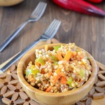 Подавать гречку с овощами можно в виде гарнира или как самостоятельное блюдо. Такое кушанье прекрасно подходит для приготовления на даче. Делается оно просто и быстро и даже в холодном виде не теряет свою привлекательность. Очень удобно использовать гречневую крупу в пакетиках. Пока она варится, буквально по 2-3 минуты обжариваются овощи, что позволяет им сохранить аромат и свежесть. Перец чили придаёт блюду лёгкую остроту и аромат, болгарский перец и чеснок - пикантность, морковь - сладкую нотку, а томатная паста - приятную кислинку. Вот такое разнообразие вкусовых ощущений! Так что, пока огородники убирают свой инструмент, переодеваются и моют руки, а соседи по даче, соскучившись за зиму, подтягиваются, соблазняясь на ароматы, можно приготовить это вкусное и сытное блюдо.