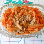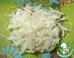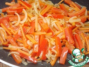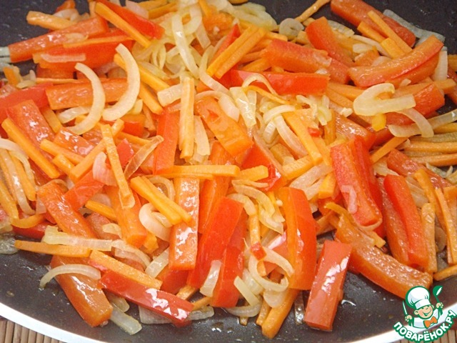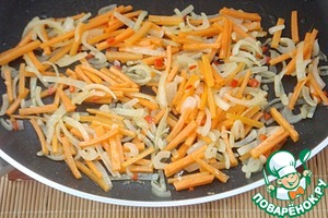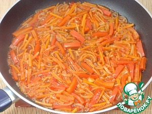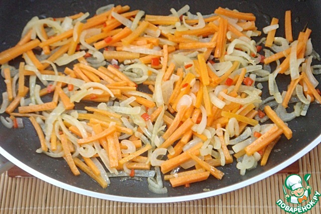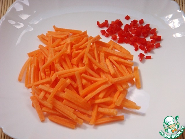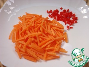 Морковь - соломкой, перец чили - мелкими кубиками.