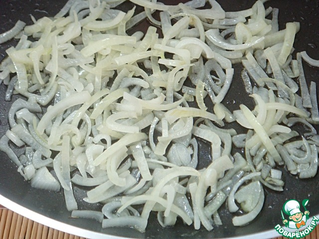 На разогретую сковороду налить растительное масло и обжарить в нем нарезанный лук в течение двух минут.