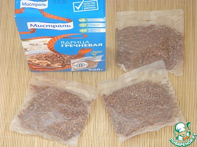- Крупа гречневая (Ядрица гречневая в пакетиках ТМ "Мистраль" 180 г) — 3 пакет.