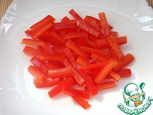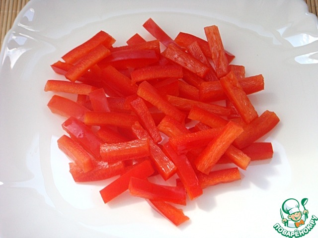 Поставить разогревать сковороду. Сладкий перец нарезать брусочками.