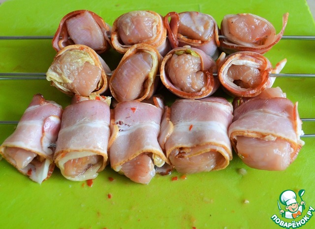 На полоску бекона положить лист чимчи и кусочек грудки.
