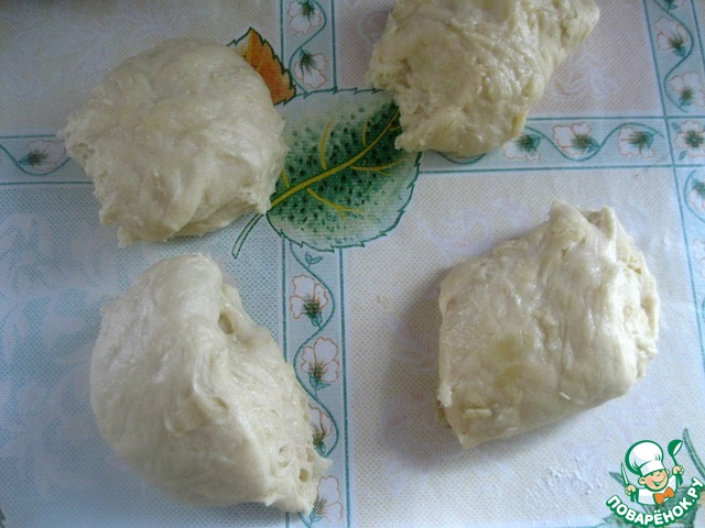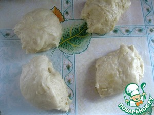 Включить духовку на 200*. Тесто делим на 4 части. Из каждой раскатываем тесто в тонкий пласт.