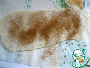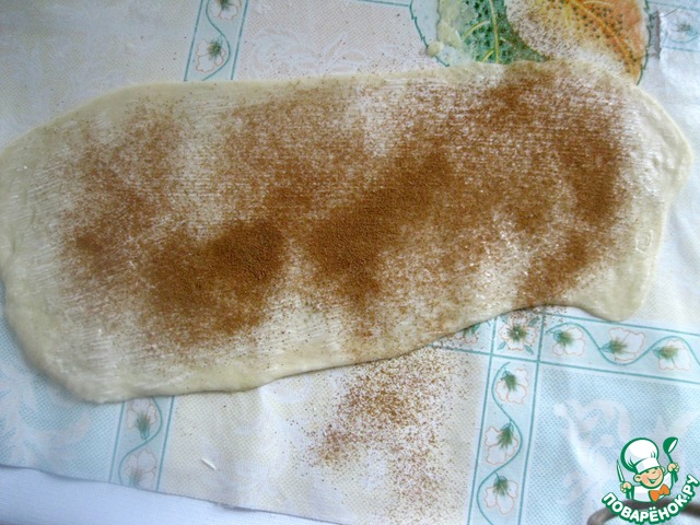 Первые 2 части смазать сметаной и посыпать корицей. Свернуть рулетом и разрезать на равные части.