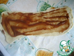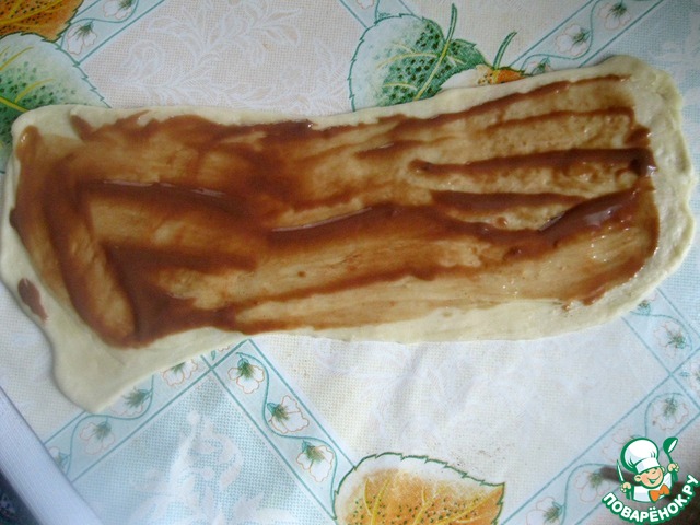 А другие 2 части промазать шоколадной пастой. Свернуть рулетом и разрезать на равные части.