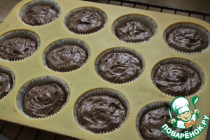 • Разогреть духовку до 180 градусов. Формочки для кексов наполнить на половину объема. Положить немного начинки.