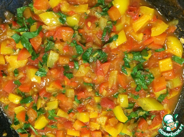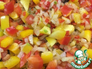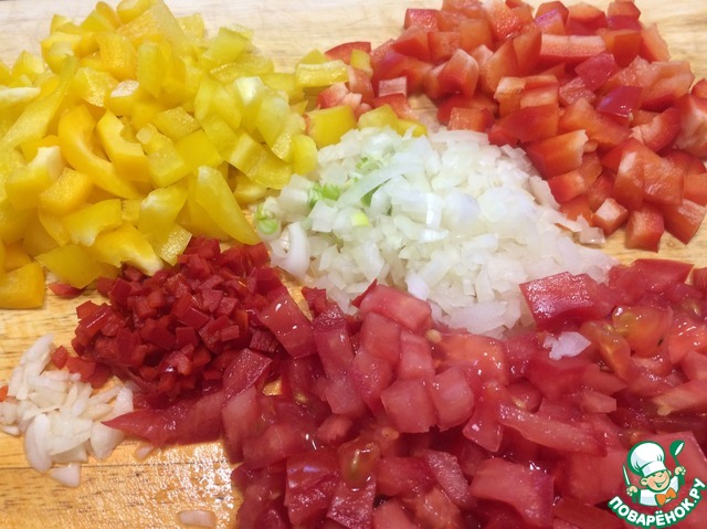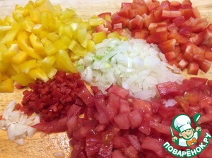 Нарезать овощи. Лук, чеснок, красный острый перец очень мелко. Болгарский перец и помидоры небольшими кубиками.