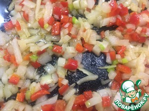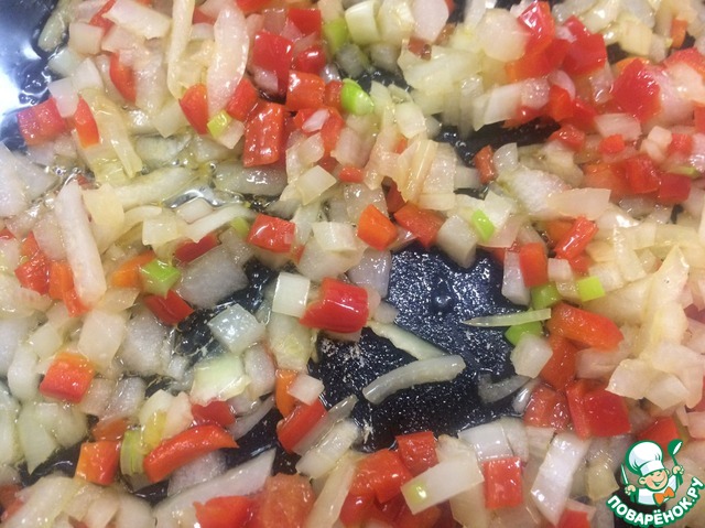 На сковороде разогреть растительное масло, у меня оливковое, и обжарить лук, перец и чеснок буквально минутку.