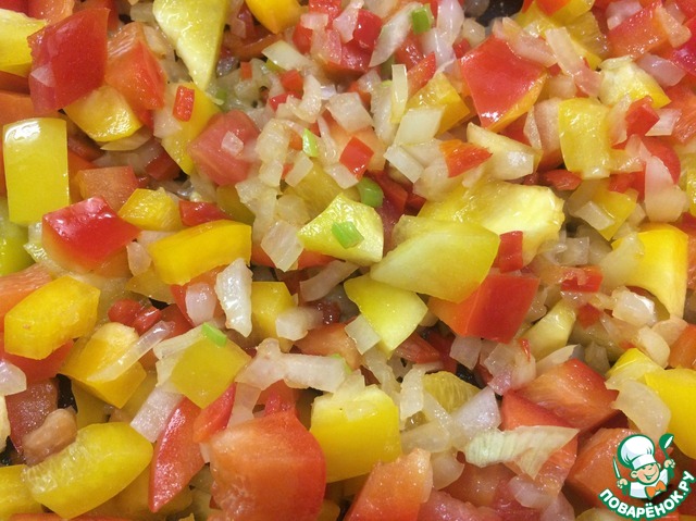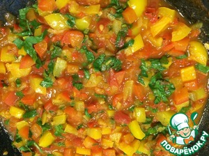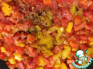 Затем, добавить болгарский перец, помешивая обжарить минуты 3. К обжаренным овощам добавить помидоры.