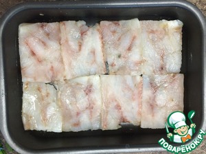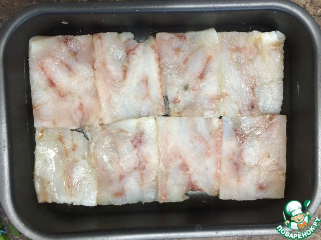 Форму для запекания немного смазать растительным маслом, уложить филе. Для более быстрого приготовления, я разрезала филе вдоль, чтобы кусочки получились тоньше.