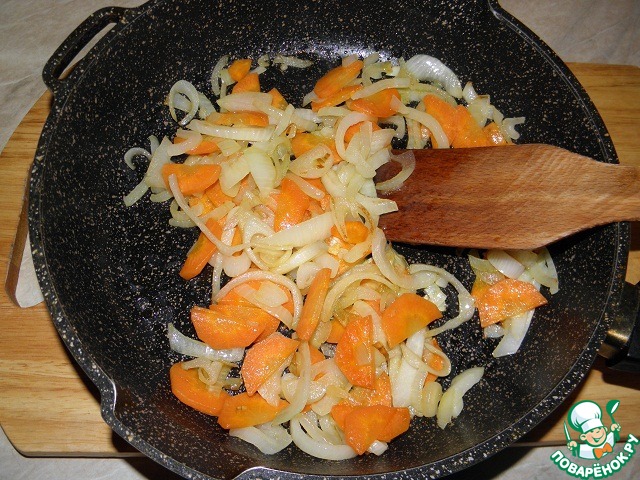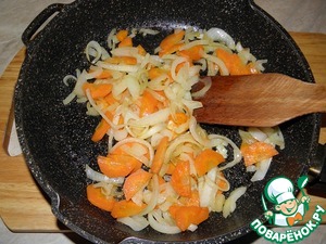 Морковь нарезать лепестками, лук четверть-кольцами, обжарить на раскаленном масле.